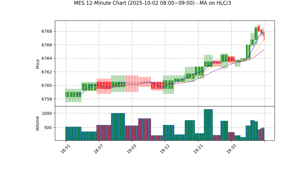 – 价格行为:本次可见K线极窄幅波动(高6768.00 / 低6767.50),属于盘整/铸顶形态的早期特征,显示多空观望。