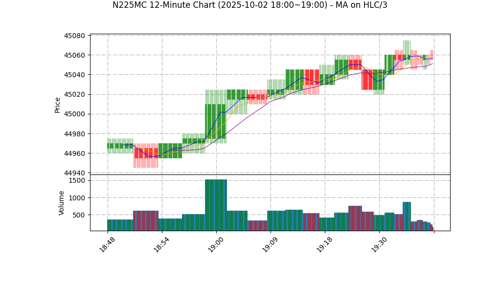 10-02 19:00 | 45065.00 | 45075.00 | 45065.00 | 45070.00 | 227 | 44895.00 | 60.5 | 19.787 | 0.50 |