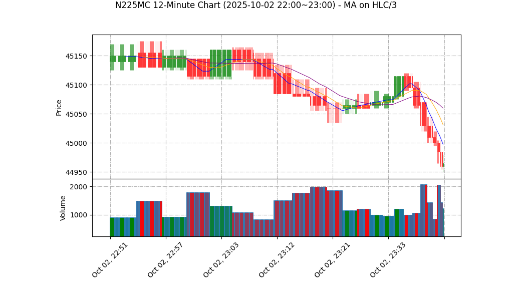 10-02 23:00 | 44960.00 | 44980.00 | 44950.00 | 44980.00 | 803 | 44964.25 | 52.2 | 6.641 | 0.50 |