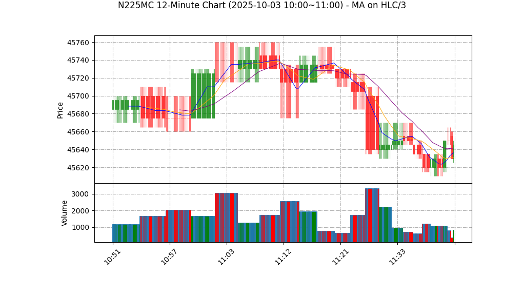 10-03 11:00 | 45630.00 | 45650.00 | 45625.00 | 45640.00 | 624 | 45166.25 | 74.0 | 57.576 | -0.50 |