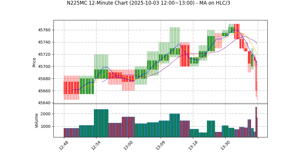 10-03 13:00 | 45660.00 | 45705.00 | 45660.00 | 45695.00 | 2059 | 45227.00 | 75.3 | 57.674 | -2.50 |