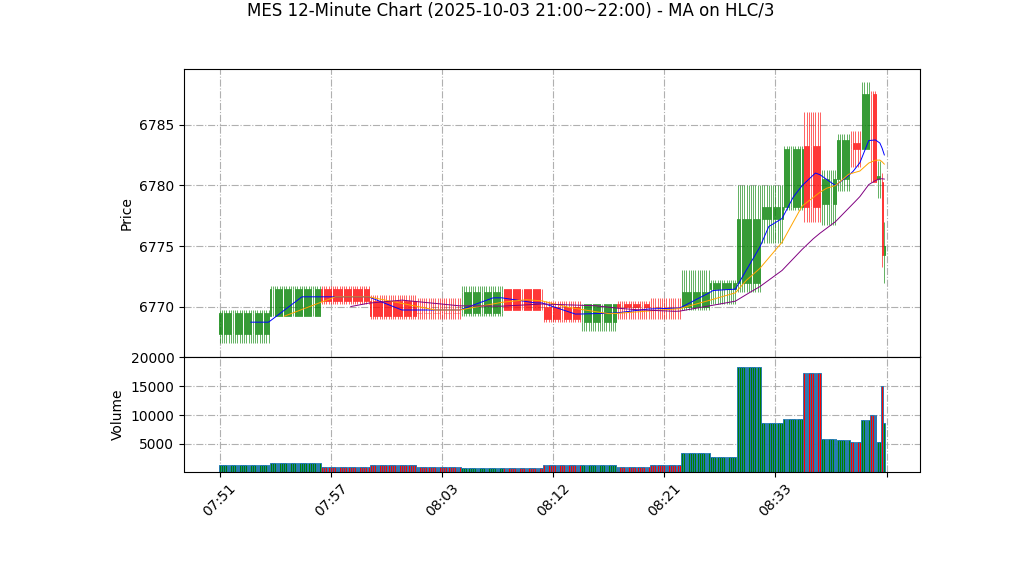 – 价量/价格行为(权重15%):当前K线为小幅震荡(高6781、低6773.75),无突破性实体,倾向盘整。