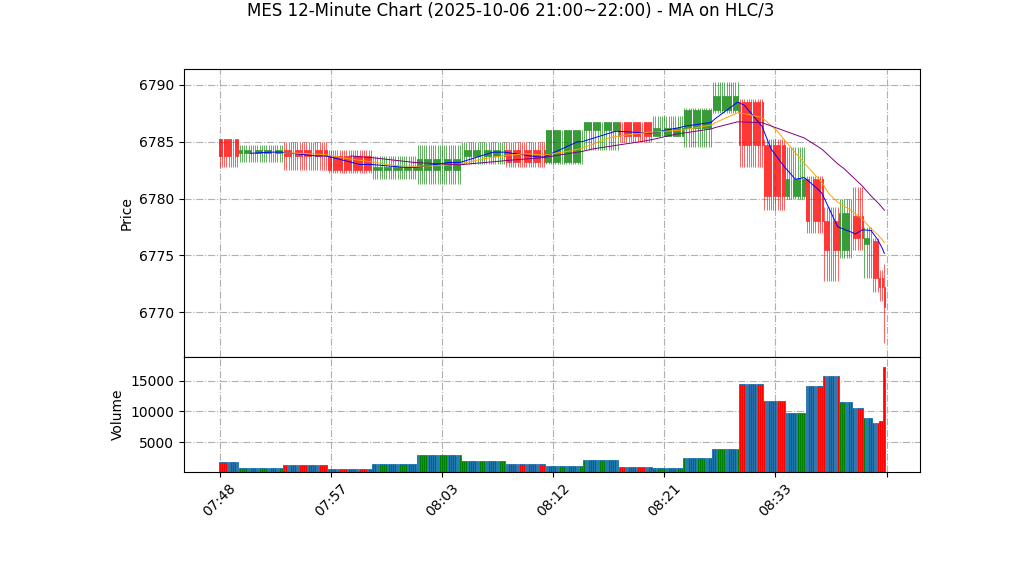 – MA20:当前价6771 < MA20 6779.81 ——均线作为短期阻力,显示下方承压。评分:偏空(强度中等)。 - RSI:42.8 ——未到超卖,但处于偏弱区间,说明卖压存在但未极端。评分:偏空(强度弱到中)。 - 价格行为:单根小实体蜡烛(开6772.25 高6772.25 低6770 收6771)——低振幅,空头/多头都未展现强烈接管。评分:中性偏空。 - 波动/成交量:报告显示波动和历史动量数据接近0,且仅1/10记录,无法有效支持结论,降低总体置信。 综合:指标多数偏空但强度并非极端,且数据缺乏历史样本支持,故判定短线偏空但置信度受限。