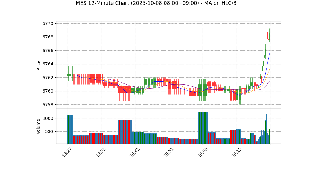 – 当期K线结构:开6765.25 高6769.75 低6764.75 收6767.50 —— 小幅区间震荡,实体小,买卖双方均无明显胜出,典型“盘整/犹豫”K线。