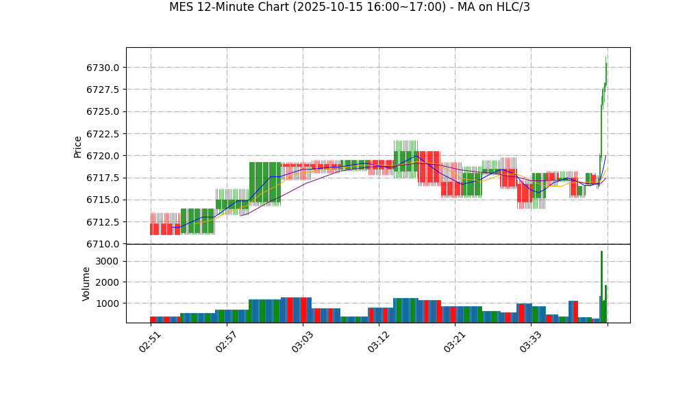 – 形态:当前仅观测单根K线系记录(开6717.25 高6731.25 低6716.50 收6730.50),形成上影线很短的收高,显示小幅买盘压制到高位但未大幅突破顶部阻力。总体看短期为窄幅上升或盘整。