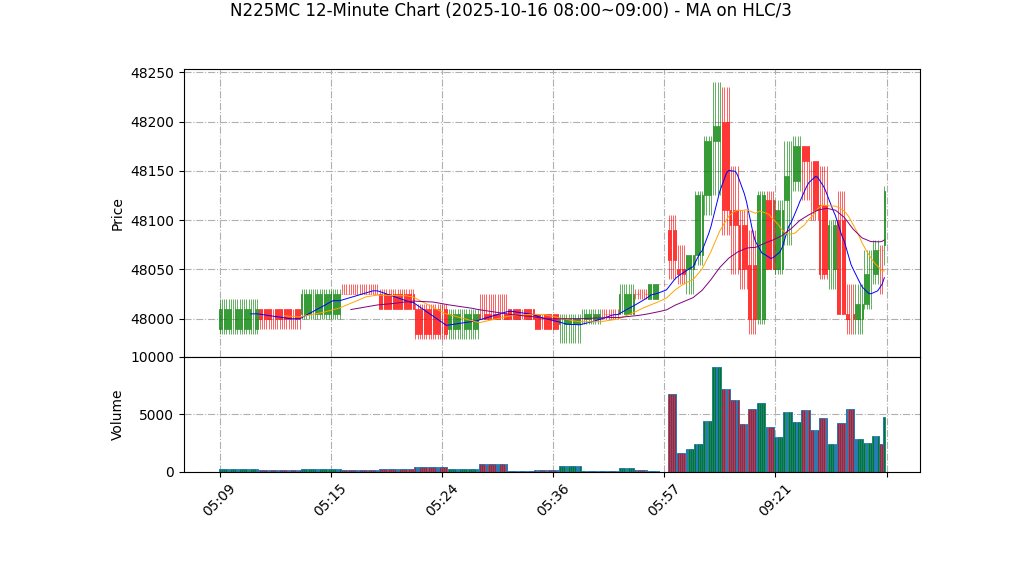 主要风险包括:1) 数据严重不完整(仅1/10条记录),导致技术信号失真;2) 指标冲突(MA短多 vs MACD负动量)可能引发快速反转;3) 盘中突发基本面/消息(宏观、日经相关政策、成交量骤变)会迅速改变技术格局。关键反转信号需关注:MACD柱持续回升转正并伴成交量放大、价格稳固收于 48140 以上或失守并收于 47960 以下。