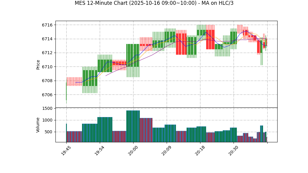 – 价格行为(当小时:开6713.50 高6713.75 低6713.25 收6713.25):收盘贴近或等于最低价,短线上行失败,权重 15%。