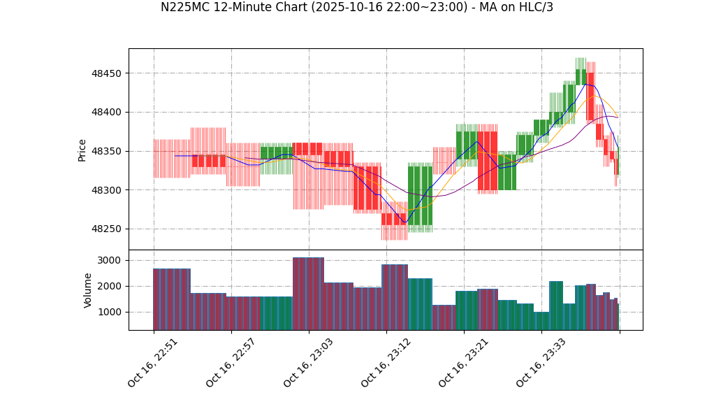 10-16 23:00 | 48320.00 | 48360.00 | 48315.00 | 48350.00 | 549 | 48235.75 | 60.4 | -21.572 | -0.25 |
