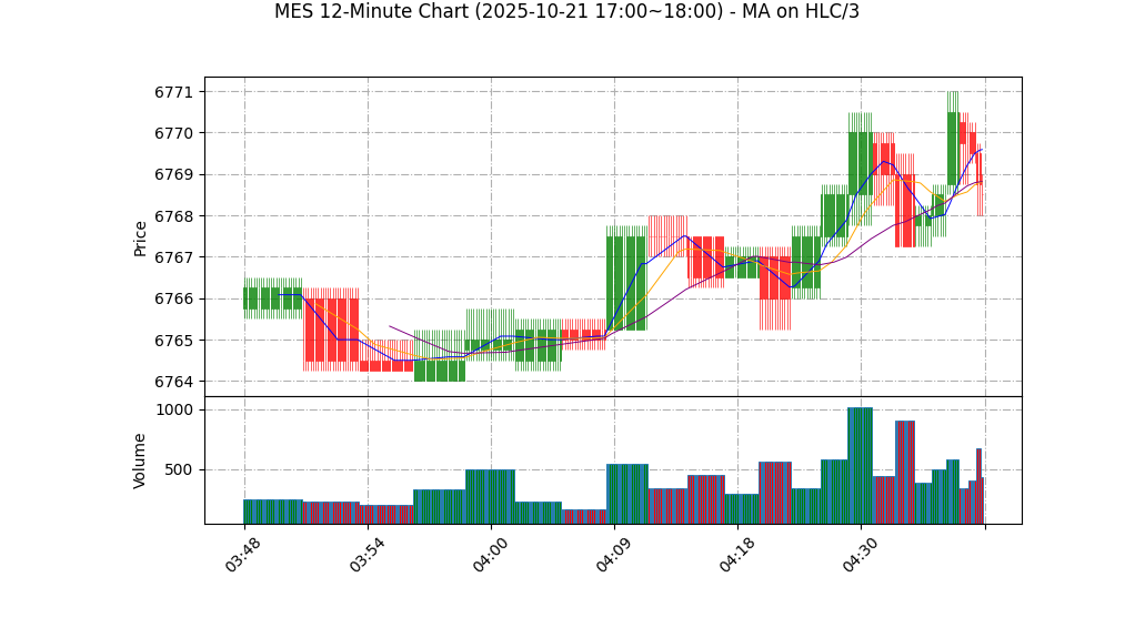 – 支撑阻力:短期即刻阻力位:MA20附近 ~6772.8,近期高点 ~6769.00(极近);短期支撑位:近期低点 ~6768.50,若下破则打开进一步下行空间。由于数据稀少,支撑/阻力带非常窄,易被短时成交冲击。