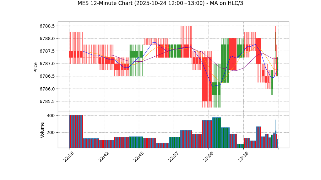– 价格行为:当前K线区间极窄(开6787.50 高6788.00 低6787.25 收6787.75),属于盘整/窄幅震荡,缺乏明显趋势延伸的确认烛形。