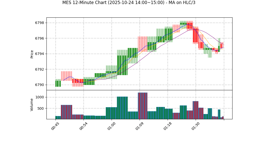 – 价格行为:当前单条记录显示极小范围的水平盘整(开6795.25,低6794.75,收6795.00),缺乏趋势延续或明显K线形态确认。短期无明显突破、假突破或连续高低点结构无法验证。