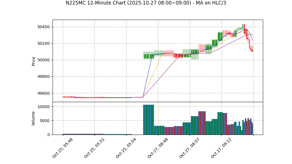| 10-27 09:00 | 50125.00 | 50170.00 | 50095.00 | 50160.00 | 6152 | 49546.75 | 74.0 | 53.763 | -0.75 |