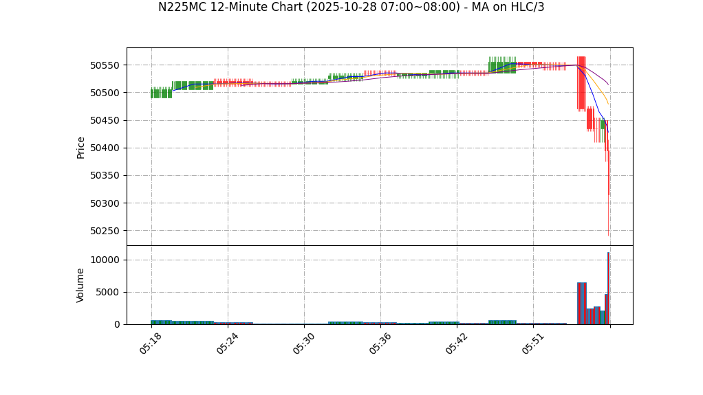 | 10-28 08:00 | 50395.00 | 50415.00 | 50285.00 | 50320.00 | 6450 | 50457.25 | 55.2 | -57.414 | -3.75 |