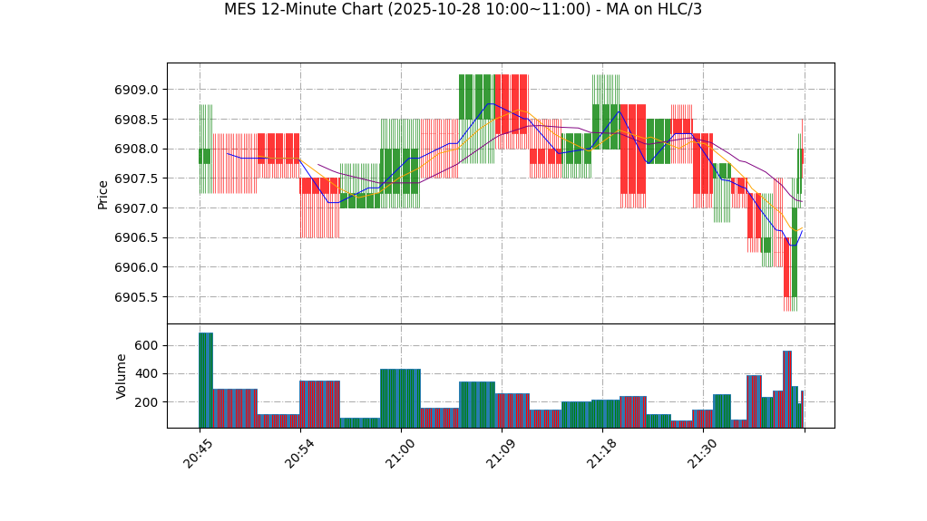 1) 形态:可用历史数据极少(仅1条小时数据),无法确认经典形态(如头肩、旗形、三角形等)。当前小时K线为窄幅上涨(开=6907.50,收=6907.75),显示多空胶着、成交节奏薄弱。