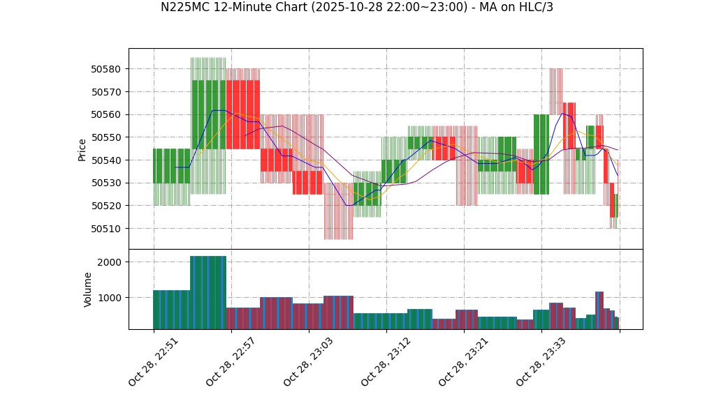 | 10-28 23:00 | 50520.00 | 50540.00 | 50520.00 | 50525.00 | 268 | 50412.75 | 59.4 | -3.583 | 2.25 |