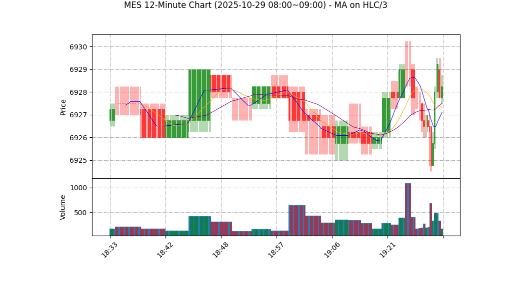 价格走势呈窄幅盘整形态,最高6929.50与最低6925.50区间仅4点,波动率0.00%表明趋势强度极弱;支撑位初步看6925.50(近期最低),阻力位6929.50(近期最高)。价格略高于MA20但未形成有效突破,缺乏趋势确认,形态偏向震荡收敛。