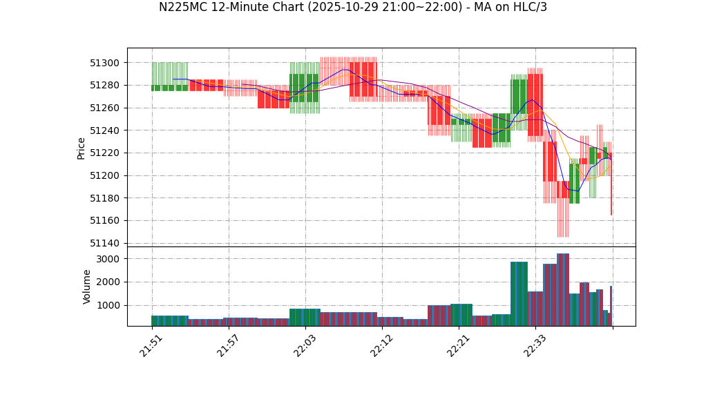 | 10-29 22:00 | 51220.00 | 51230.00 | 51175.00 | 51175.00 | 792 | 51086.50 | 60.7 | -19.970 | -1.25 |