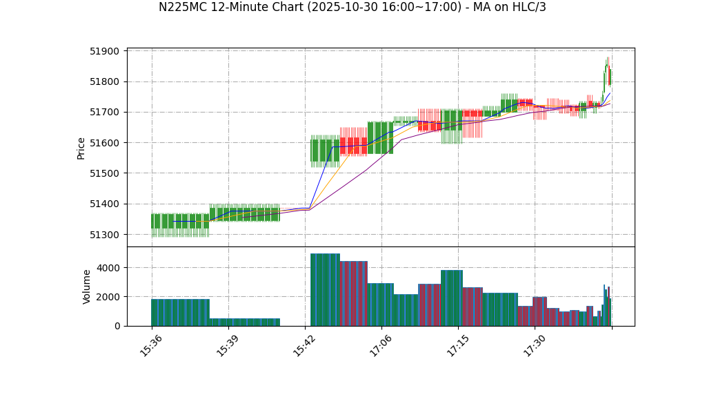 | 10-30 17:00 | 51765.00 | 51880.00 | 51760.00 | 51830.00 | 12518 | 51310.75 | 66.0 | 25.802 | 1.00 |