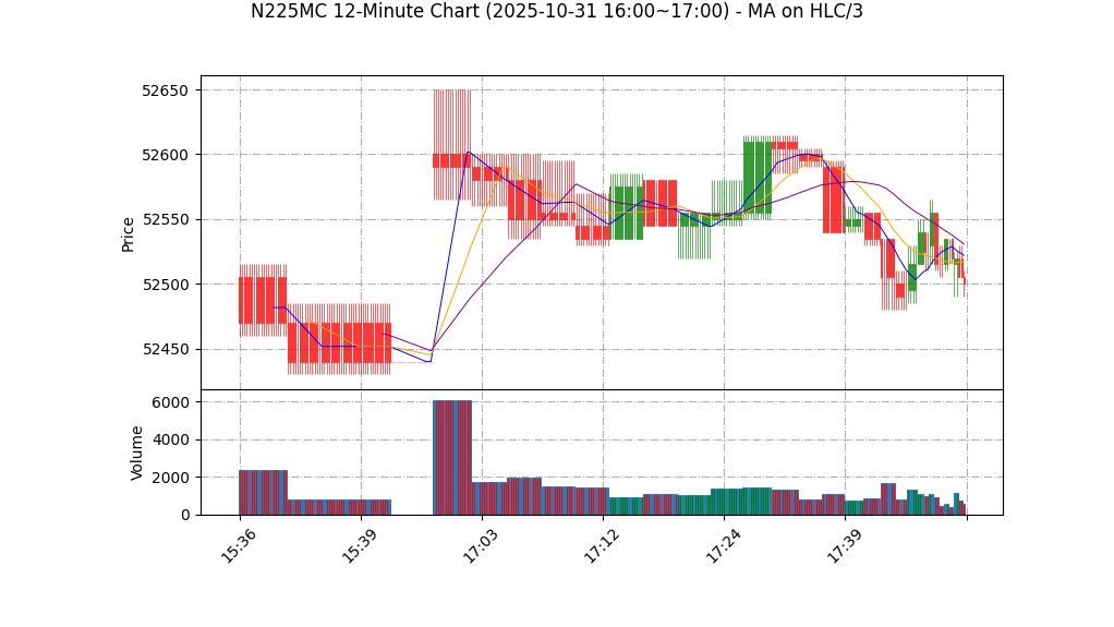 | 10-31 17:00 | 52530.00 | 52565.00 | 52490.00 | 52495.00 | 5403 | 51885.25 | 66.1 | 64.407 | -1.50 |