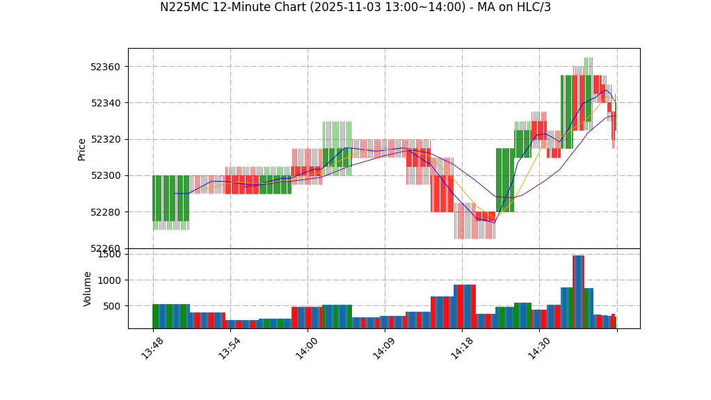 | 11-03 14:00 | 52345.00 | 52375.00 | 52340.00 | 52370.00 | 608 | 52367.25 | 56.6 | -36.839 | 2.00 |