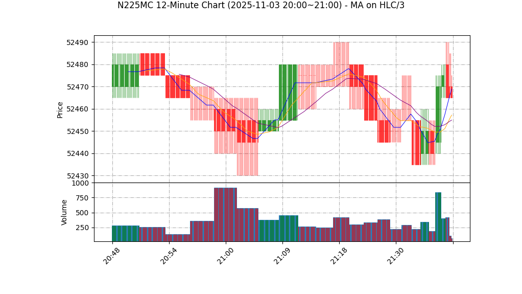 | 11-03 21:00 | 52465.00 | 52470.00 | 52450.00 | 52460.00 | 351 | 52343.00 | 58.8 | -6.571 | 2.50 |