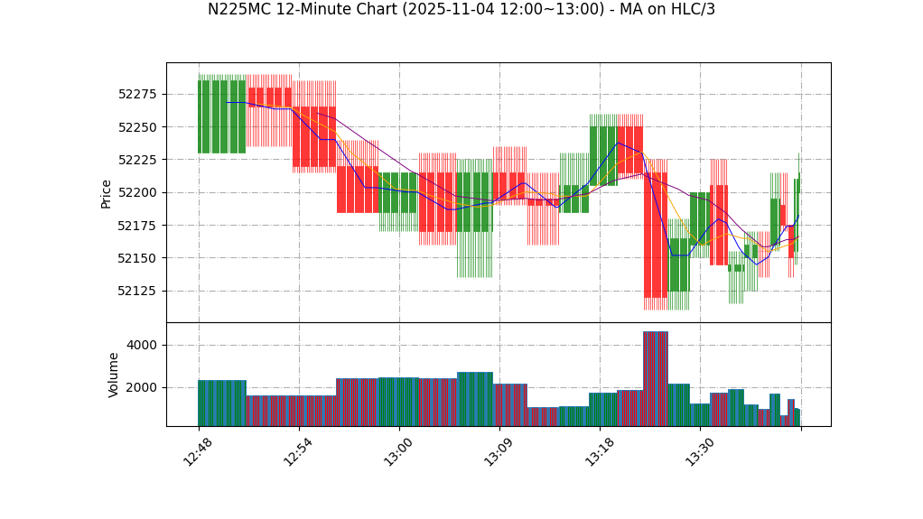| 11-04 13:00 | 52215.00 | 52225.00 | 52180.00 | 52205.00 | 726 | 52416.50 | 44.1 | -40.998 | -3.50 |