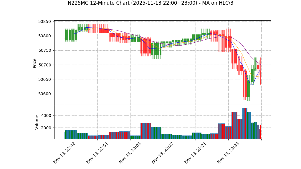 | 11-13 23:00 | 50680.00 | 50725.00 | 50675.00 | 50685.00 | 945 | 51085.50 | 34.3 | -59.172 | -0.75 |