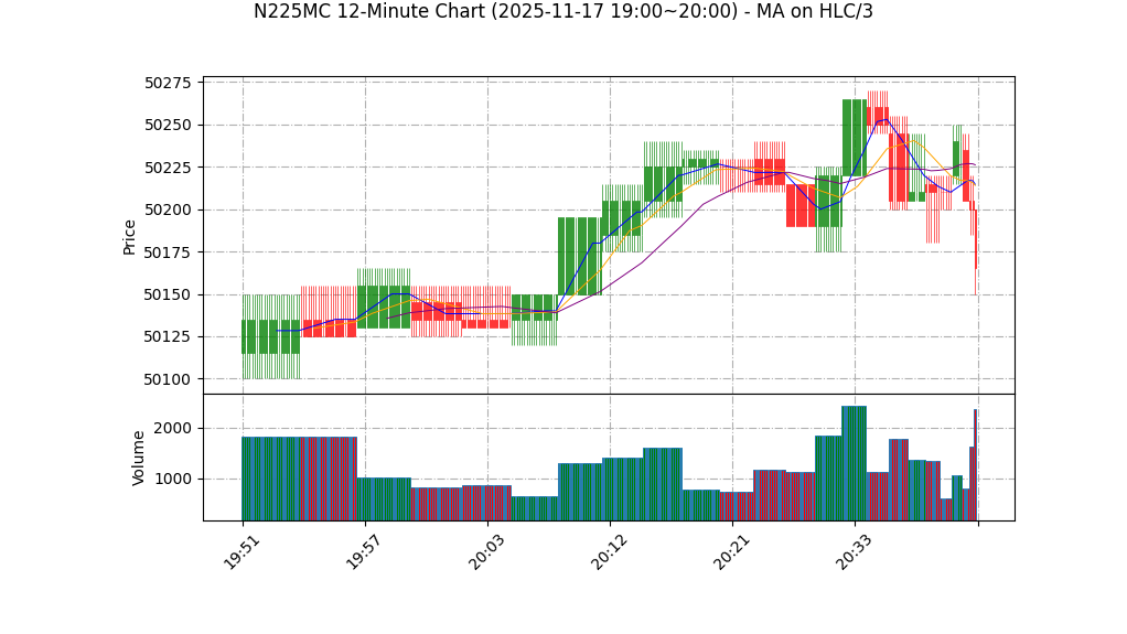 | 11-17 20:00 | 50200.00 | 50200.00 | 50155.00 | 50155.00 | 1214 | 50283.25 | 43.6 | 5.252 | -2.75 |