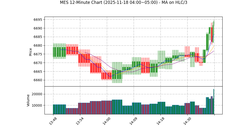 – MA20(6758) vs 现价(6696.50):现价低于MA20 ≔ 中短期趋势偏空,MA20作为首要阻力;给予该信号中等权重(30%)。