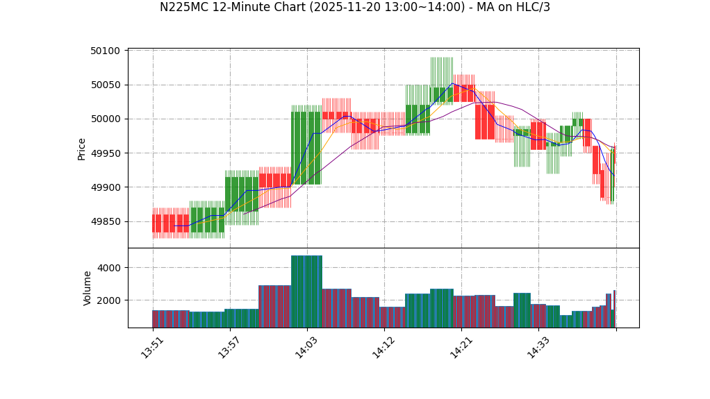 – 价格结构:当前柱体区间窄(最高49965、最低49925,区间40点),短期内缺乏明显冲击性成交,属于窄幅震荡向上,未形成明显K线形态(例如明确的突破或反转)。