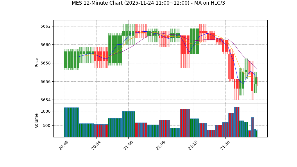– 日内K线(11:00~12:00)显示极小实体蜡烛:开6655.25,高6655.50,低6654.75,收6654.75,表明多空交投相持,收盘略偏空(收低于开),属于不确定性信号。