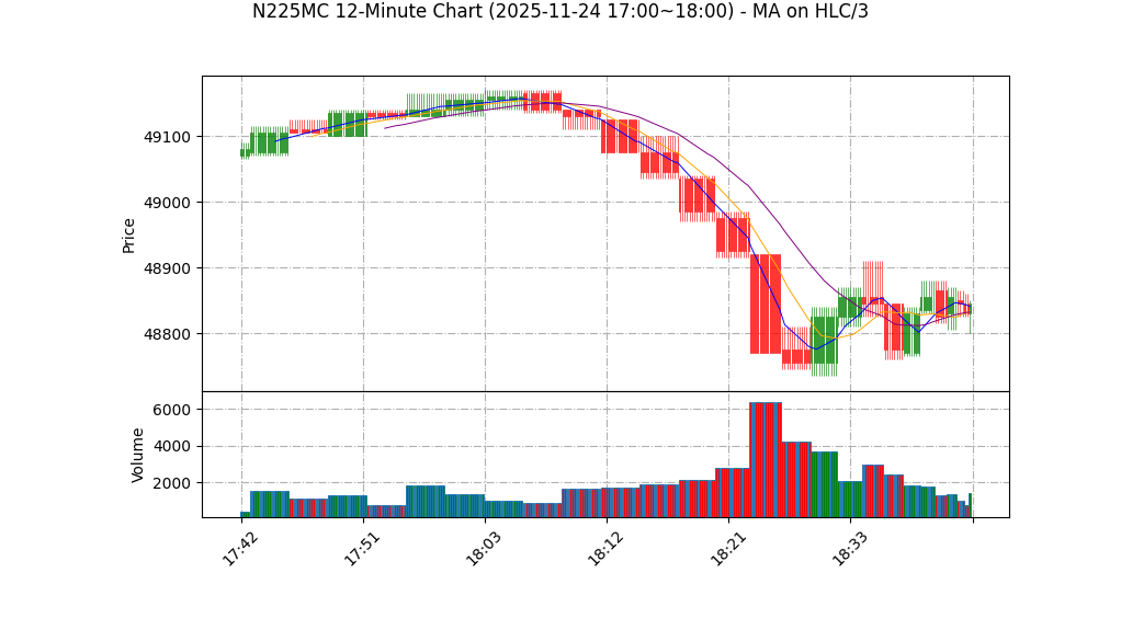 | 11-24 18:00 | 48830.00 | 48835.00 | 48800.00 | 48805.00 | 793 | 48807.50 | 47.6 | 27.087 | -2.00 |