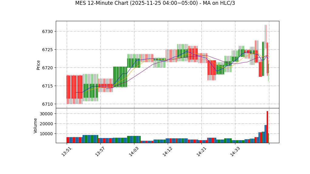 – 价格行为:最近10小时记录仅最后一条,极窄区间(高6719.50 / 低6716.25 / 收6719.00),呈整理性微涨收盘,无法确认清晰趋势或经典形态(如突破、头肩、旗形等)。