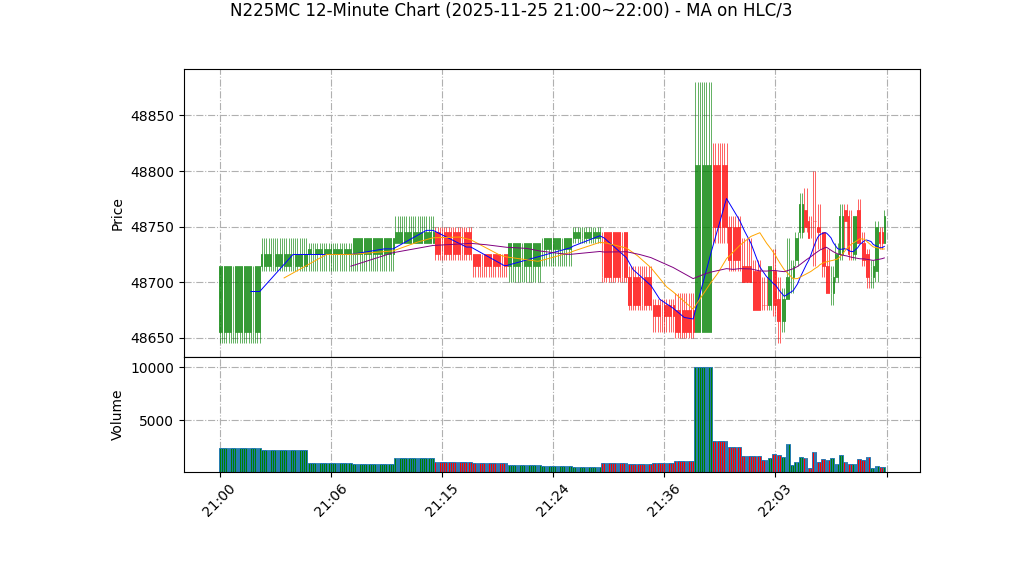 | 11-25 22:00 | 48765.00 | 48775.00 | 48695.00 | 48750.00 | 6052 | 48969.75 | 45.3 | -28.671 | -0.75 |