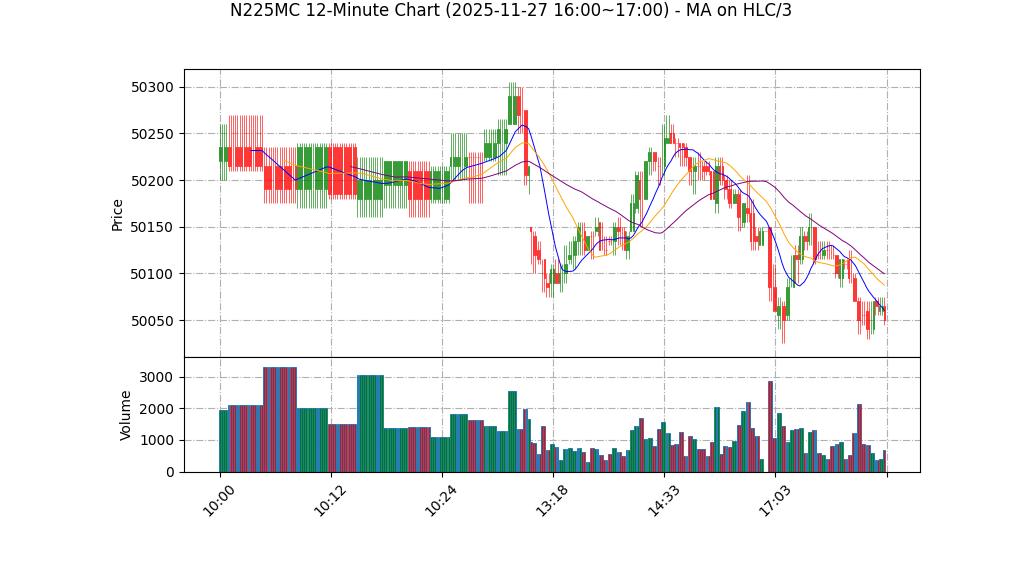| 11-27 17:00 | 50070.00 | 50075.00 | 50030.00 | 50070.00 | 5273 | 49972.25 | 60.8 | -28.112 | -1.25 |