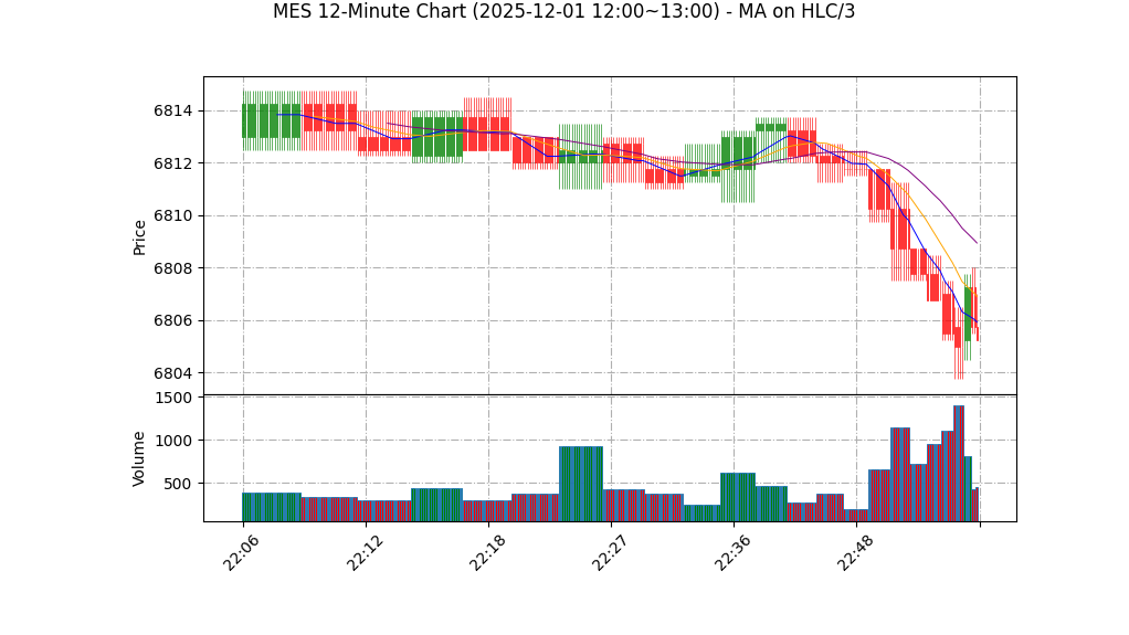 1) 形态:当前仅有单根小时数据,无法确认完整形态(无法判定头肩、三角等结构)。短线呈横盘下移,日内高低两点几乎重合(高 6808.00 / 低 6807.50),说明盘整且成交薄弱。